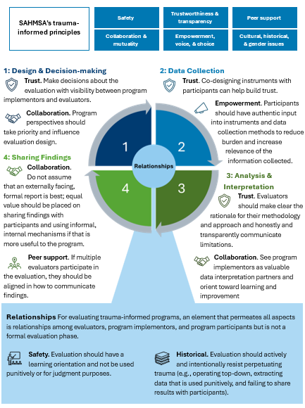 In the book chapter, Healing practices: Evaluating trauma-informed health services, the authors discuss and provide examples for how to apply SAHMSA’s six trauma-informed principles to the evaluation of trauma-informed programs. A high-level, visual summary of how trauma-informed practices can be incorporated into different phases of evaluation is available on our website.